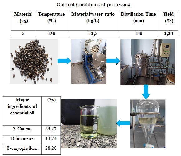 Black pepper (Piper nigrum L.) is a tropical crop with extensive medicinal potential in ethnomedicine and nutraceutical applications. In this study, the hydro-distillation method was employed in the extraction of essential oil from light berries black pepper (300g/L). Extraction parameters such as time, temperature, and the ratio of solid/solvent were optimized. The quantitative analyses of the essential oils were performed by GC/MS. The optimum yield was achieved up to 2.383% when the extract conditions were set up at material-water ratio of 1:12,5 for 180 minutes under the extraction temperature of 130 0C. The result of GC-MS showed that 3-Carene (23.27%), D-limonene (14.74%) and β-caryophyllene (28.28%) were presented as major components.The results of this study on the pilot scale could be useful for technology transfer, which mightbecome the solution to shorten the gap between research and production.