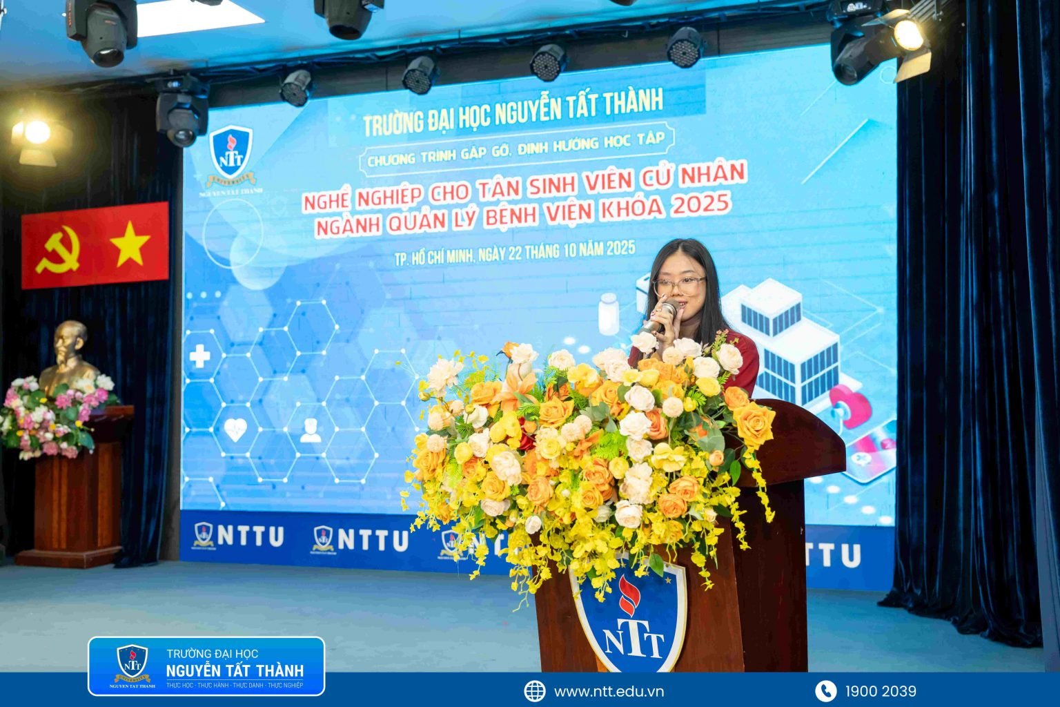 Đại diện cho tân sinh viên khóa 2025, thủ khoa đầu vào Phạm Khánh Linh đã gửi lời cảm ơn đến Quý thầy cô đồng thời là lời chào mừng dành cho tất cả tân sinh viên khóa 2025 ngành Quản lý bệnh viện. Khánh Linh cho biết, bản thân hiểu được ẩn sâu trong mỗi ca trực căng thẳng, trong từng niềm hi vọng của người bệnh là sự nỗ lực thầm lặng của những con người làm công tác quản lý, những người âm thầm sắp xếp, điều phối và duy trì cho hệ thống y tế vận hành trọn vẹn bằng cả lý trí và trái tim. Chính điều đó đã giúp Khánh Linh chọn ngành Quản lý bệnh viện. Linh hy vọng sẽ góp một phần nhỏ cho sự phát triển của ngành y tế Việt Nam.